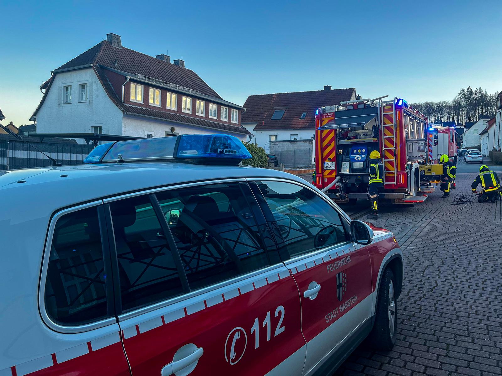 Am Mittwochabend wurde die Feuerwehr um 17:19 Uhr zusammen mit dem Rettungsdienst und der Polizei in die Hirschberger Straße in Belecke alarmiert. Unter dem Alarmierungsstichwort F3Y war ein Zimmerbrand in einem Wohnhaus mit Menschenleben in Gefahr gemeldet. Beim Eintreffen der ersten Einsatzkräfte wurde die gemeldete Lage bestätigt: Es drang dichter Rauch aus der Haustür. Drei der vier Bewohner, hatten sich vor dem Haus in Sicherheit gebracht, der Familienvater versuchte zunächst noch selbst, das Feuer zu löschen, und wurde bereits vor Eintreffen der Feuerwehr durch zwei Polizisten aus dem Haus gerufen.