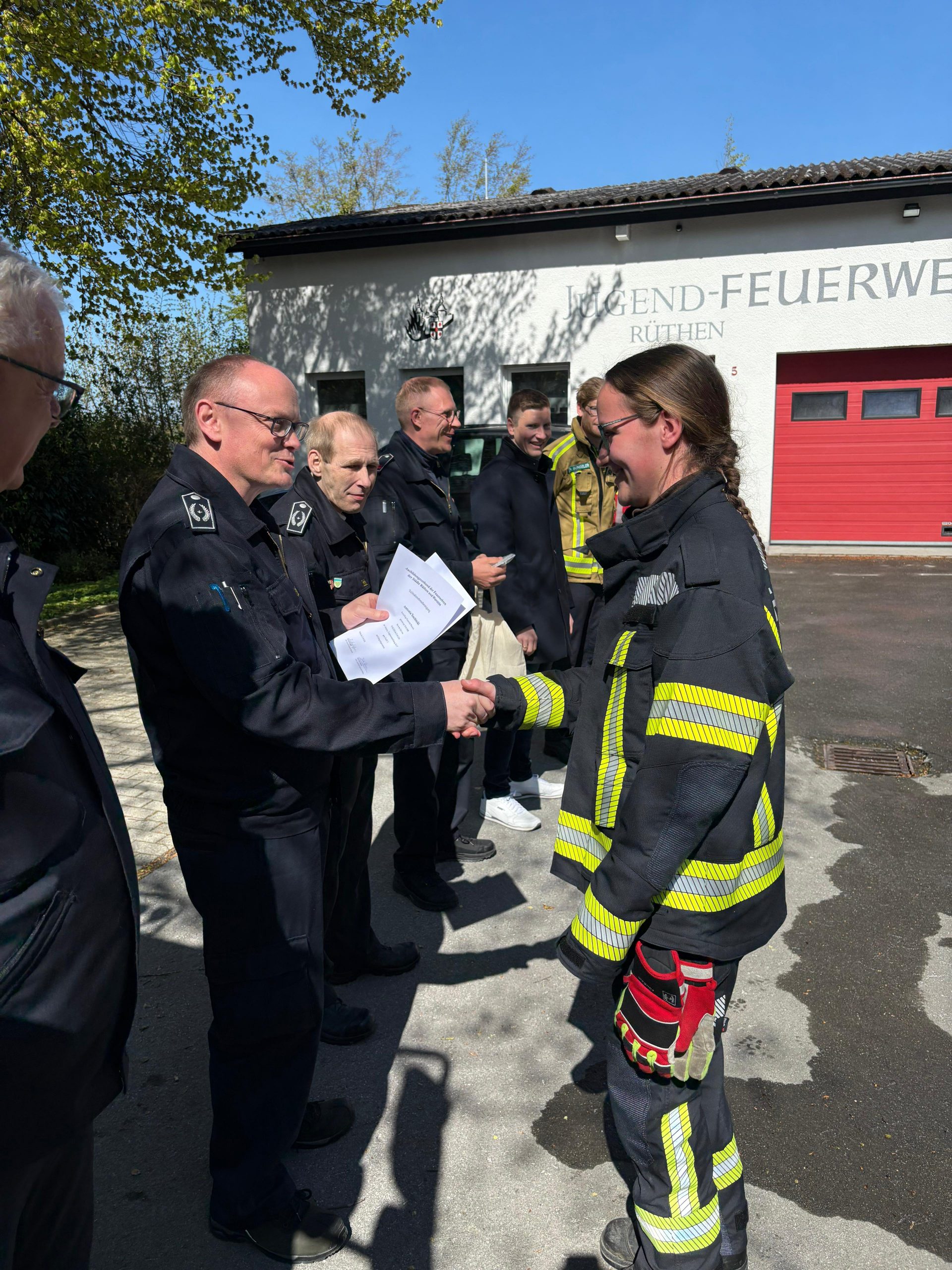 Ein simulierter Dachstuhlbrand erforderte ein koordiniertes Vorgehen im Löschangriff, während gleichzeitig eine eingeklemmte Person unter einem Minidumper gerettet werden musste. Zudem wurde eine stabile Wasserversorgung aus einem künstlichen offenen Gewässer aufgebaut. Nur durch gute Kommunikation, Teamarbeit und strukturiertes Vorgehen konnten alle Aufgaben erfolgreich abgearbeitet werden. Der praktischen Prüfung war bereits unter der Woche eine theoretische Prüfung vorausgegangen, die ebenfalls von allen Teilnehmerinnen und Teilnehmern erfolgreich abgeschlossen worden war, sodass am Ende der Abschlussübung die frisch ausgebildeten Einsatzkräfte ihre Urkunde durch die jeweiligen Wehrführungen ausgehändigt bekommen haben.